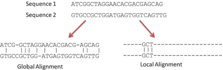 GCCAUUGCCG-UCGEn este caso, el alineamiento local es un subconjunto del alineamiento global, pero no siempre es así.