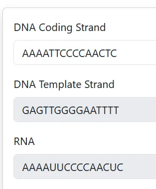 1.- Crea una pàgina web que agafi una cadena d’ADN i obtingui el revers complementar i transcrigui el seu ARN; sense fer cap crida al servidor.