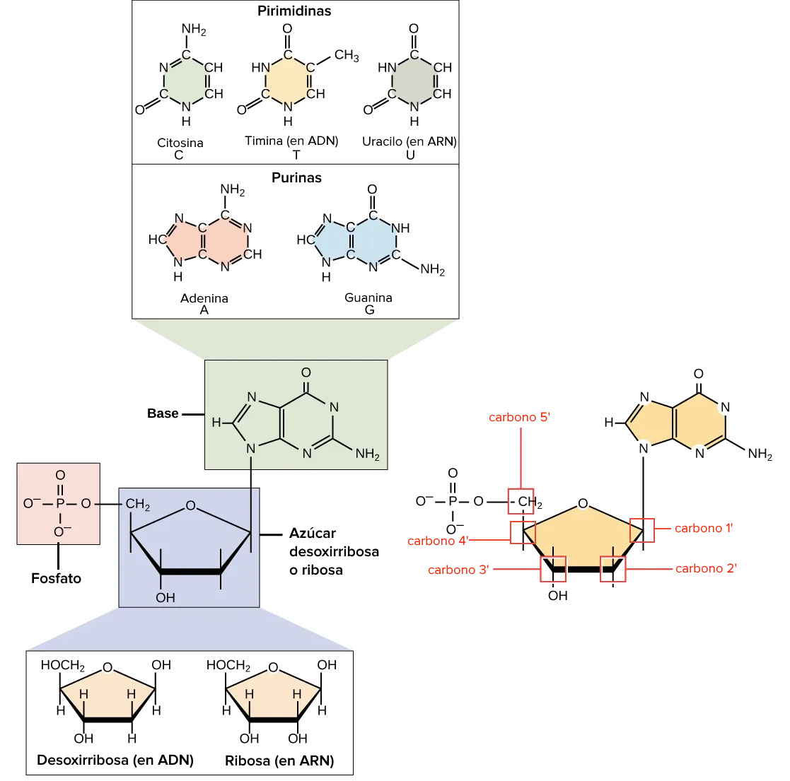 En un nucleòtid, el sucre ocupa la posició central, la base s’uneix al carboni 1’ i el grup (o grups) fosfat s’uneix al carboni 5’.
