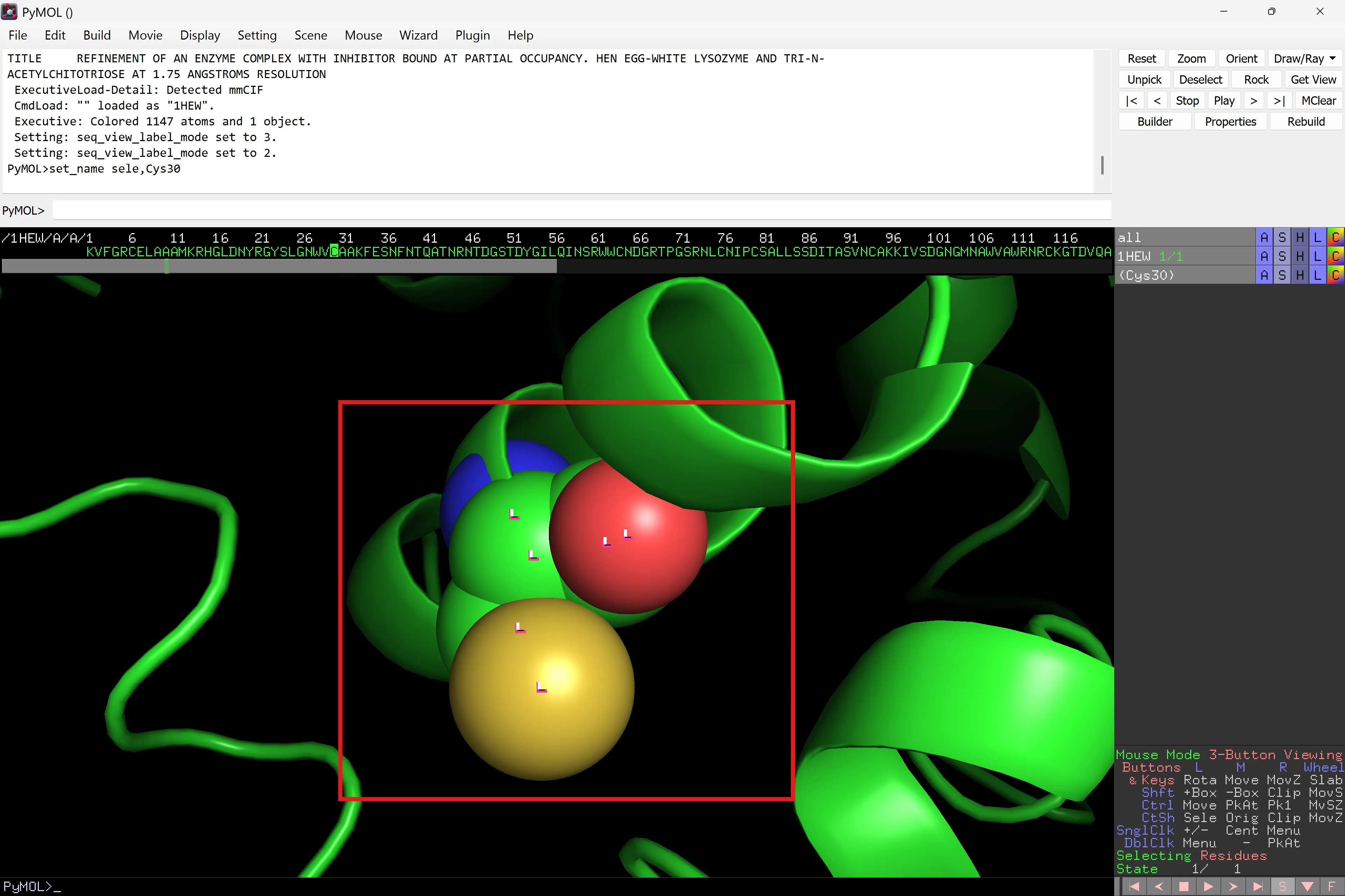 Desactiva la pestanya Cys30 – això és important perquè si no qualsevol selecció addicional s’afegirà a aquest panell. Practica seleccionant residus i canviant el nom predeterminat (sele).