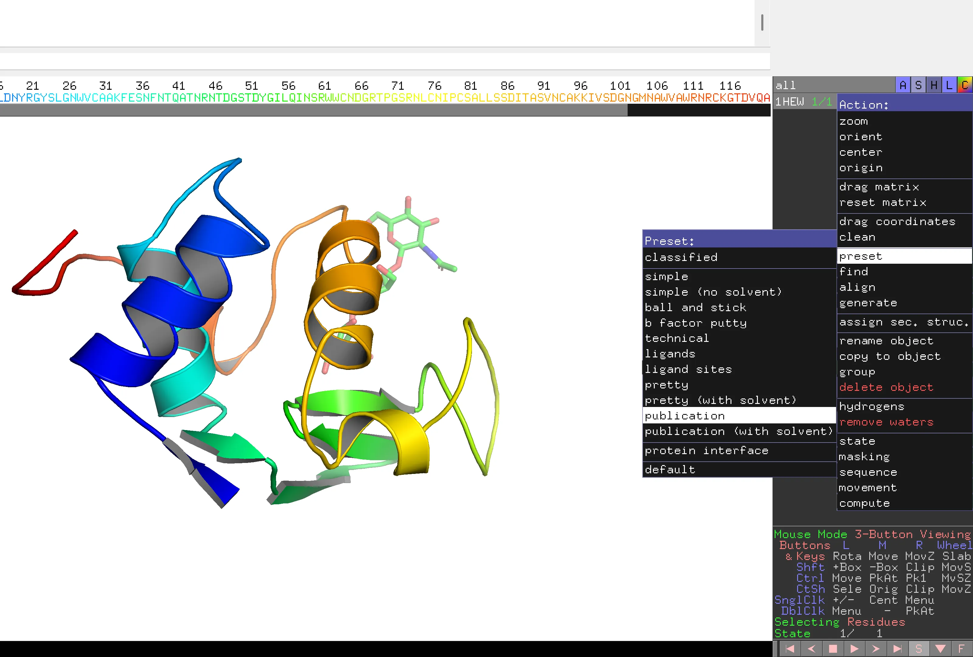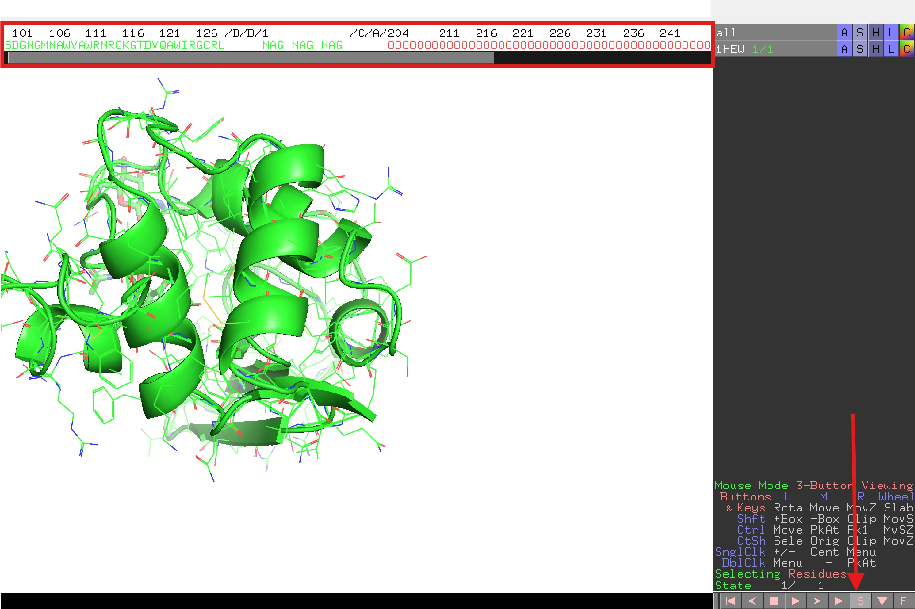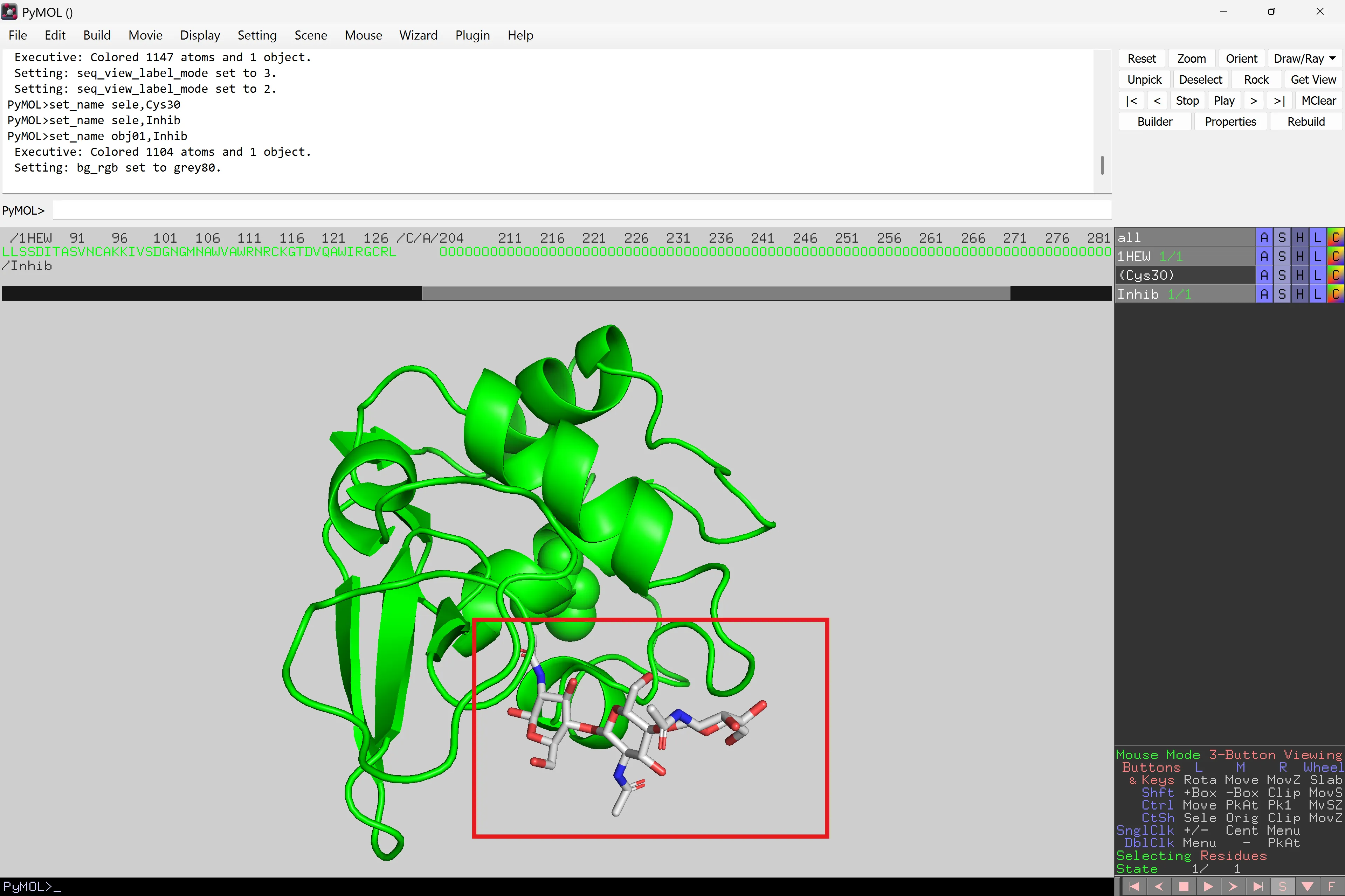 Primer, elimina qualsevol selecció (sele) del panell dret ((sele) ‘A’ > delete selection). Desplaça’t a la dreta del panell de seqüència i selecciona els 3 residus NAG. Aquests haurien de formar la nova selecció (sele). Canvia el nom a Inhib com s’ha descrit anteriorment.