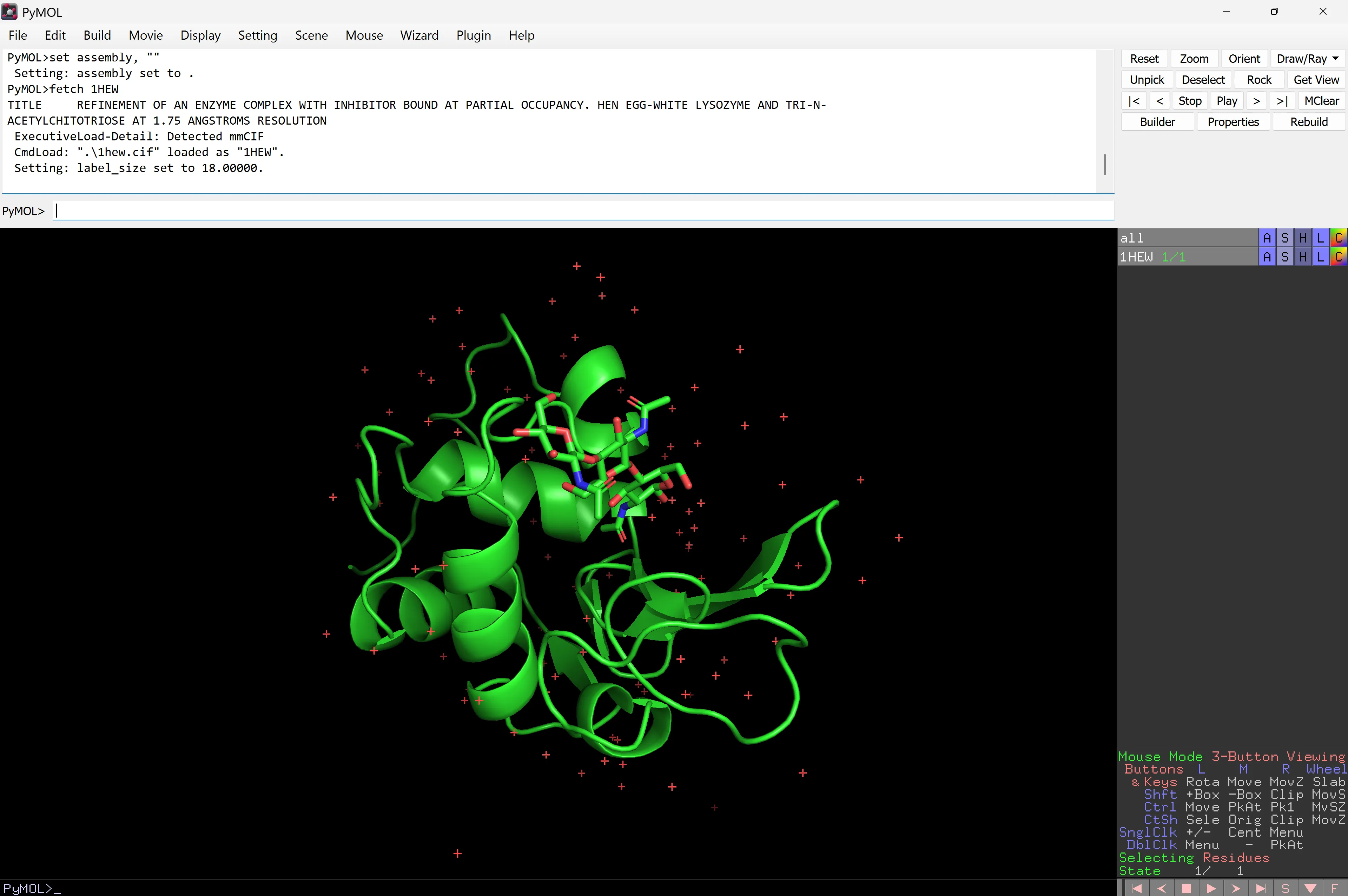 Section titled “Primers Passos”Començaràs a aprendre sobre PyMOL observant l’enzim lisozima d’ou de gallina en complex amb l’inhibidor trisacàrid tri-(N-acetilglucosamina) o tri-NAG (consulta un text de bioquímica si vols saber més sobre la lisozima). Les coordenades atòmiques d’aquest model es troben al fitxer del Protein Data Bank amb el codi 1HEW.