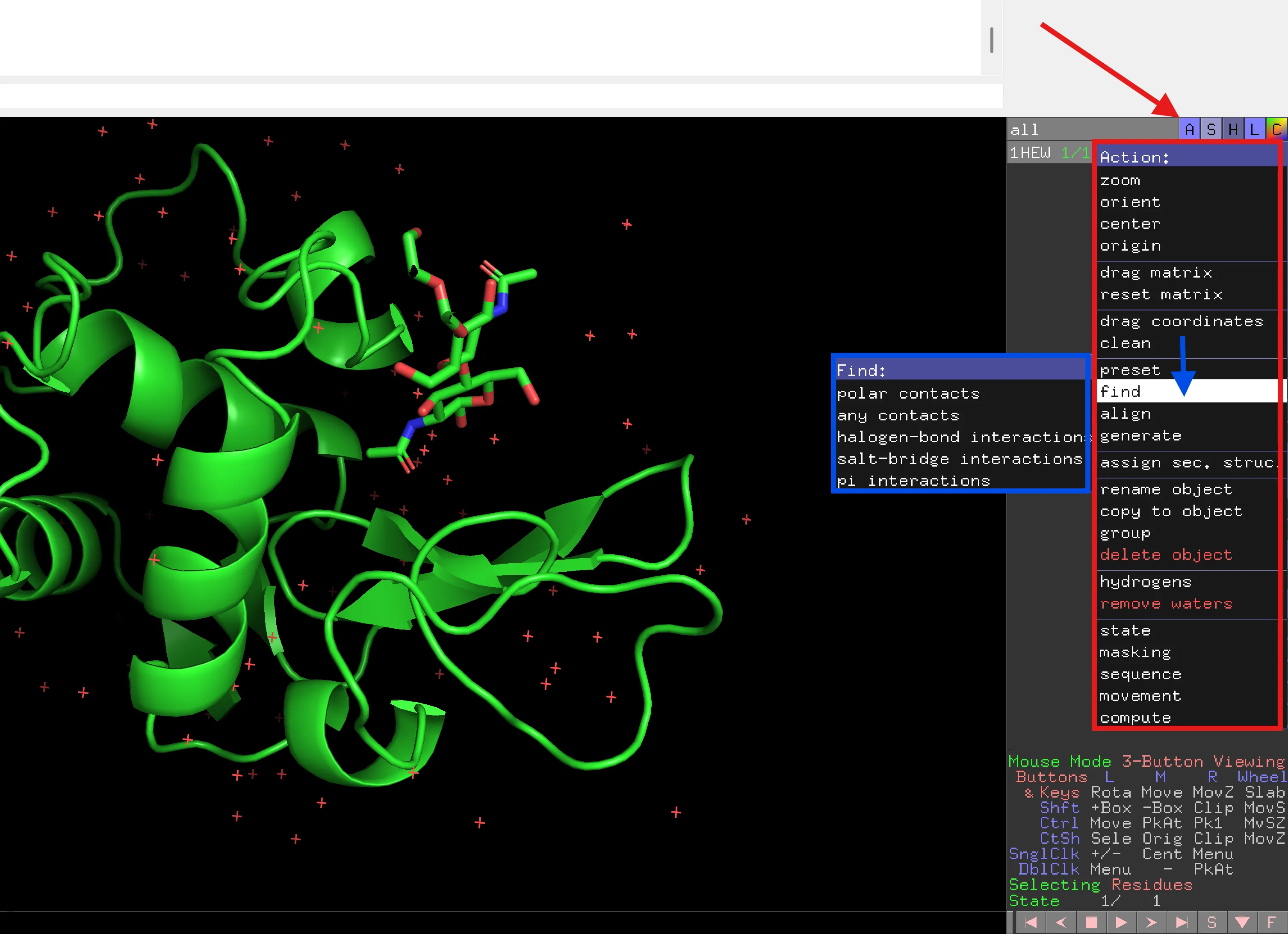 Per demostrar com es pot utilitzar PyMOL per analitzar i il·lustrar aquestes interaccions, analitzarem la selecció de l’inhibidor trisacàrid i mostrarem com interacciona amb la lisozima. Aquest és un exemple de com podem obtenir informació molecular sobre les interaccions que defineixen els efectes funcionals.