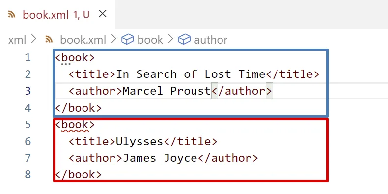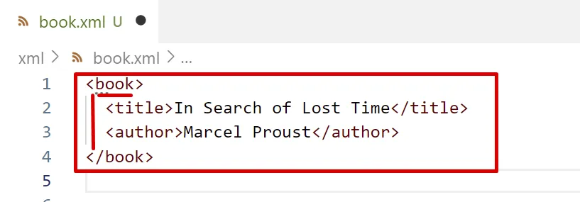 <book> <!-- Book Title --> <title>In Search of Lost Time</title> <author>Marcel Proust</author></book>Element buit