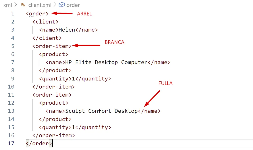 <order> <client> <name>Hellen</name> </client> <order-item> <product> <name>HP Elite Desktop Computer</name> </product> <quantity>1</quantity> </order-item> <order-item> <product> <name>Sculpt Confort Desktop</name> </product> <quantity>1</quantity> </order-item></order>Aquest format és molt útil per compartir dades entre sistemes, i fins l’arribada de {% link “/data/json/” %} era el format de dades més utilitzat.