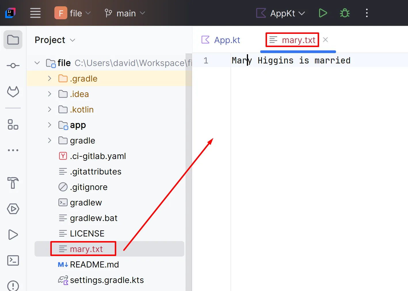 val data = Path("data") if (!data.exists()) { data.createDirectory() }}Ja pots crear el fitxer mary.txt dins la carpeta data: