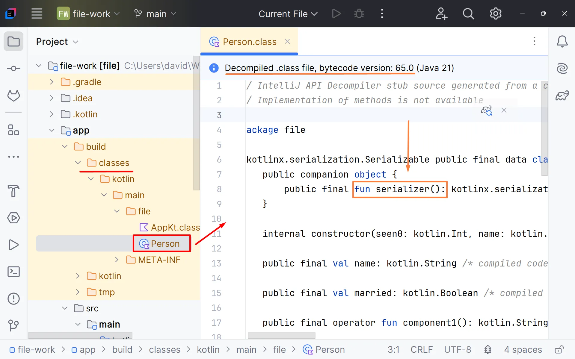 Si mires el fitxer Person.class que s’ha generat dins de la carpeta build pots veure que el “plugin” serialitzation ha generat el codi de Person.serializer() de manera automàtica:
