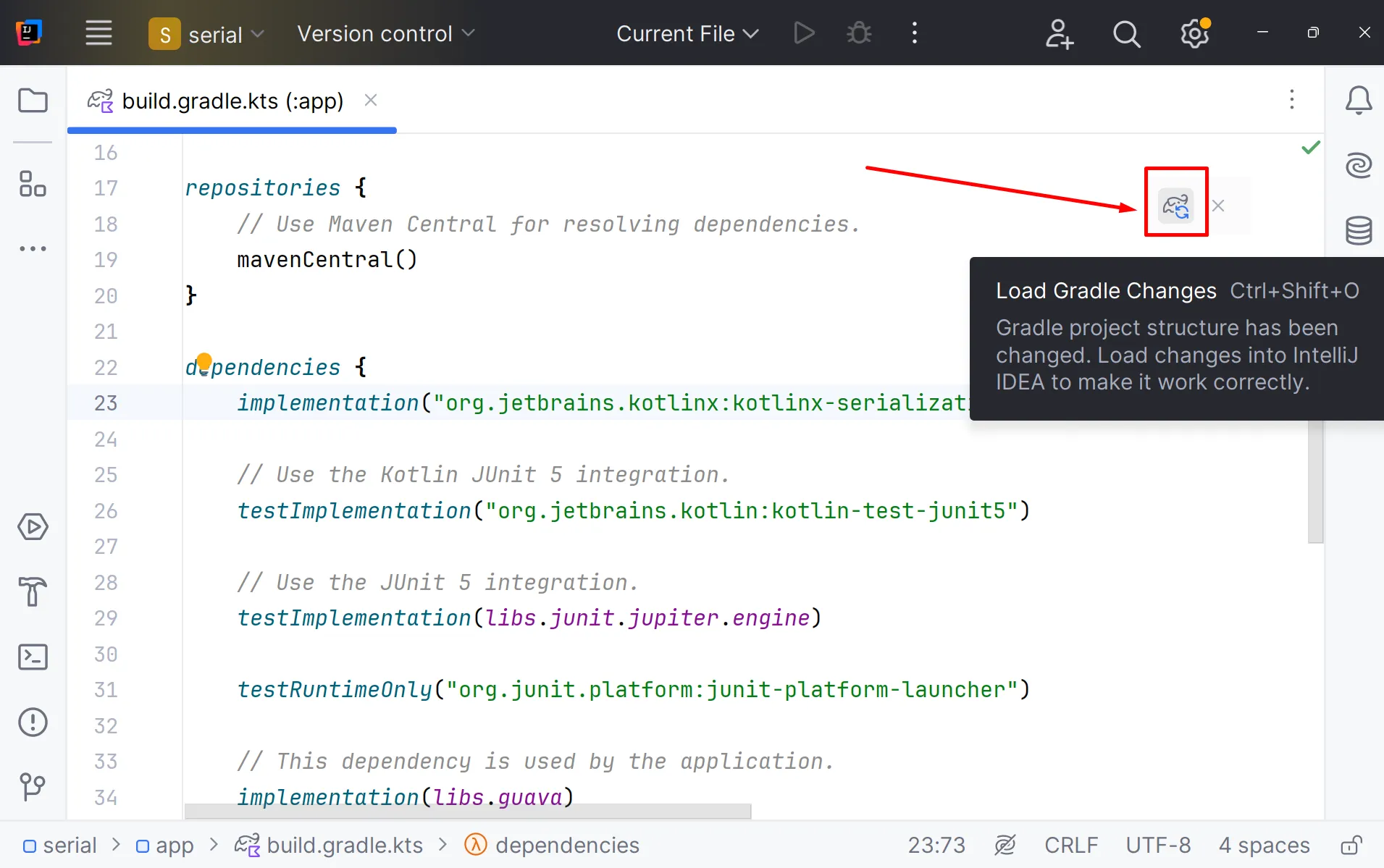 dependencies { ... implementation("org.jetbrains.kotlinx:kotlinx-serialization-json:1.7.0")}Has d’indicar a Idea que carregui els canvis que s’han fet: