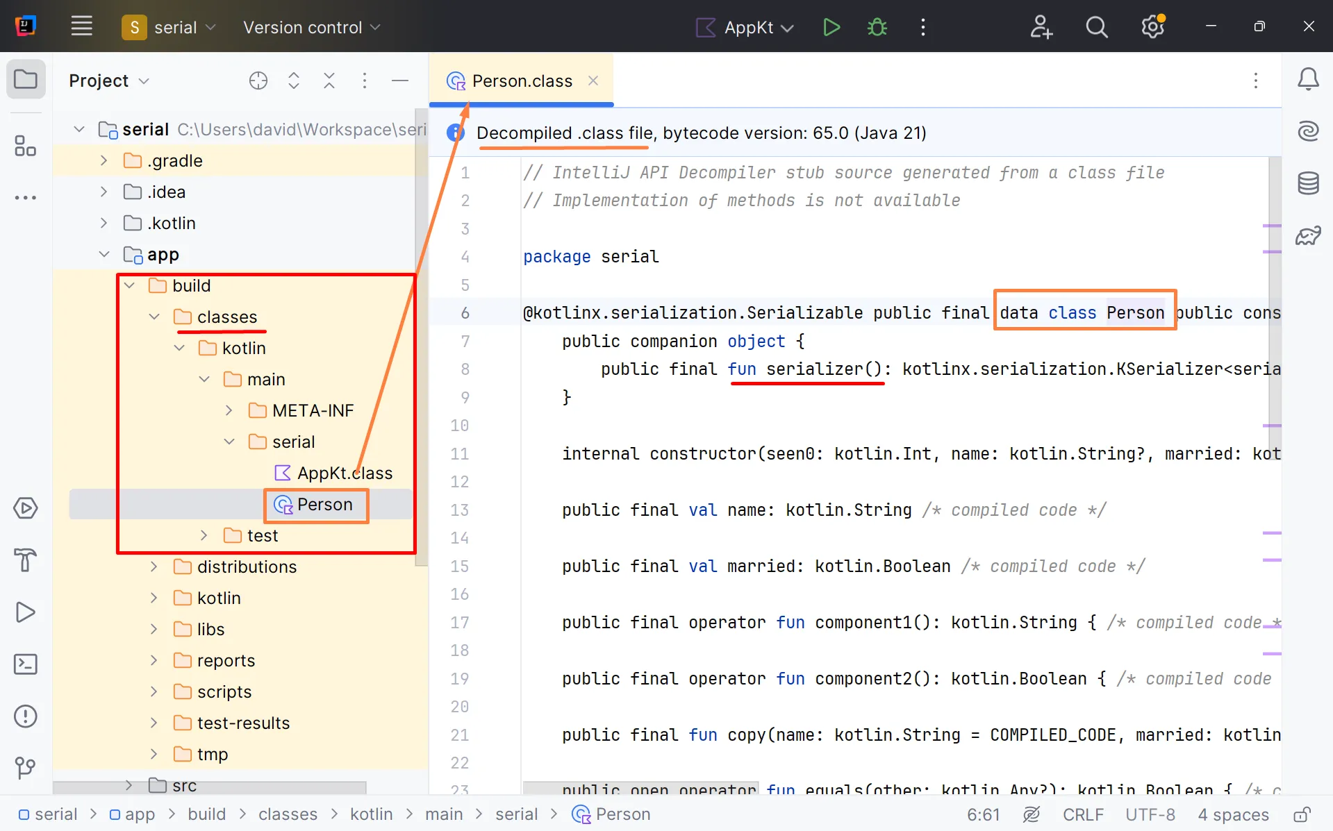 Si mires el fitxer Person.class que s’ha generat dins de la carpeta build pots veure que el “plugin” serialitzation ha generat el codi de Person.serializer() de manera automàtica: