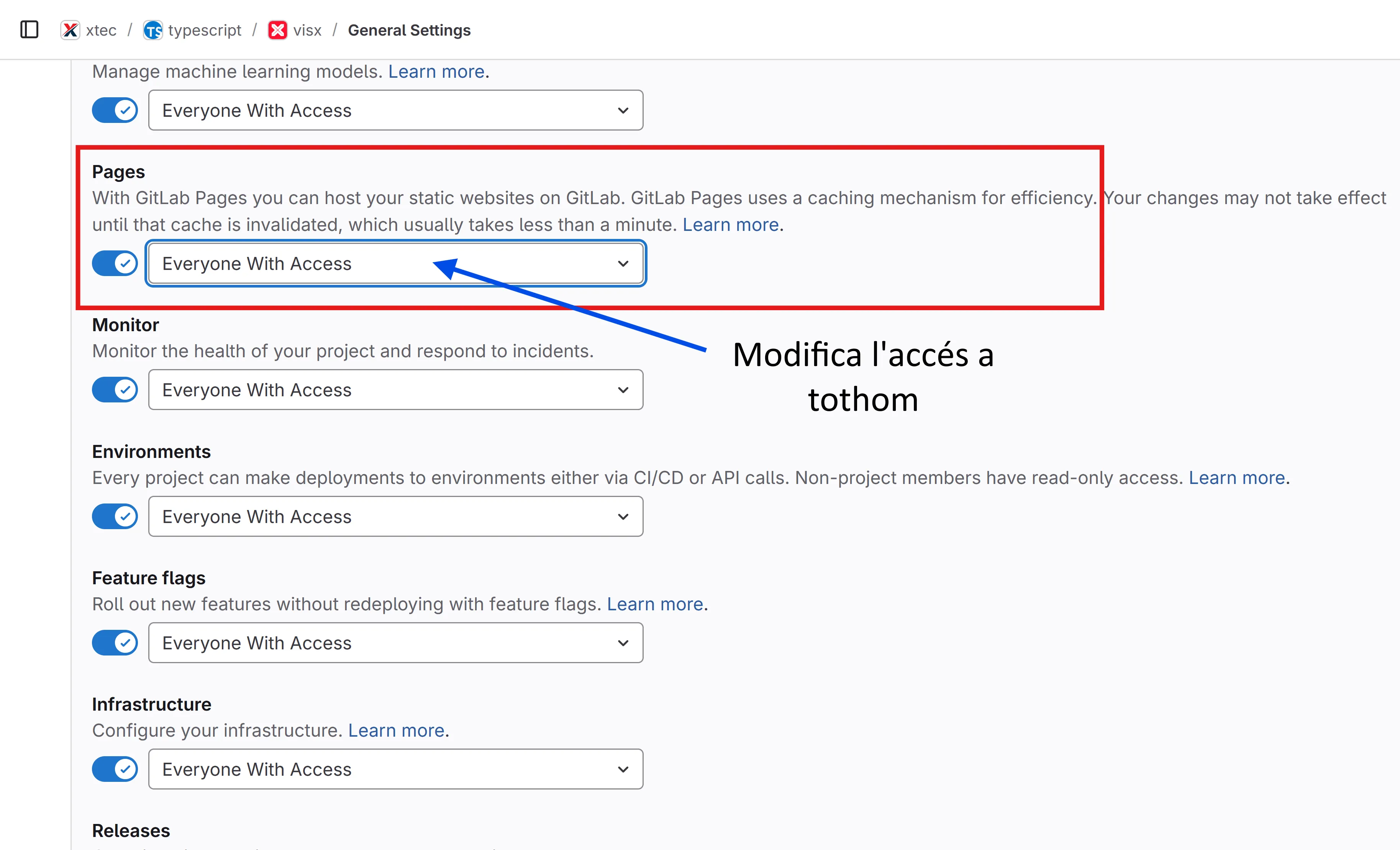 A continuació ves a General Settings > Visibility, project features, permissions, i modifica Pages a Everyone With Acces per tal que tothom pugui accedir al lloc web:
