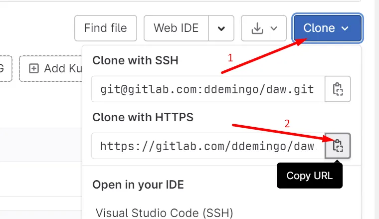 Es pot clonar un projecte fent servir ssh o https. Nosaltres farem servir https i necessitem l’adreça url: