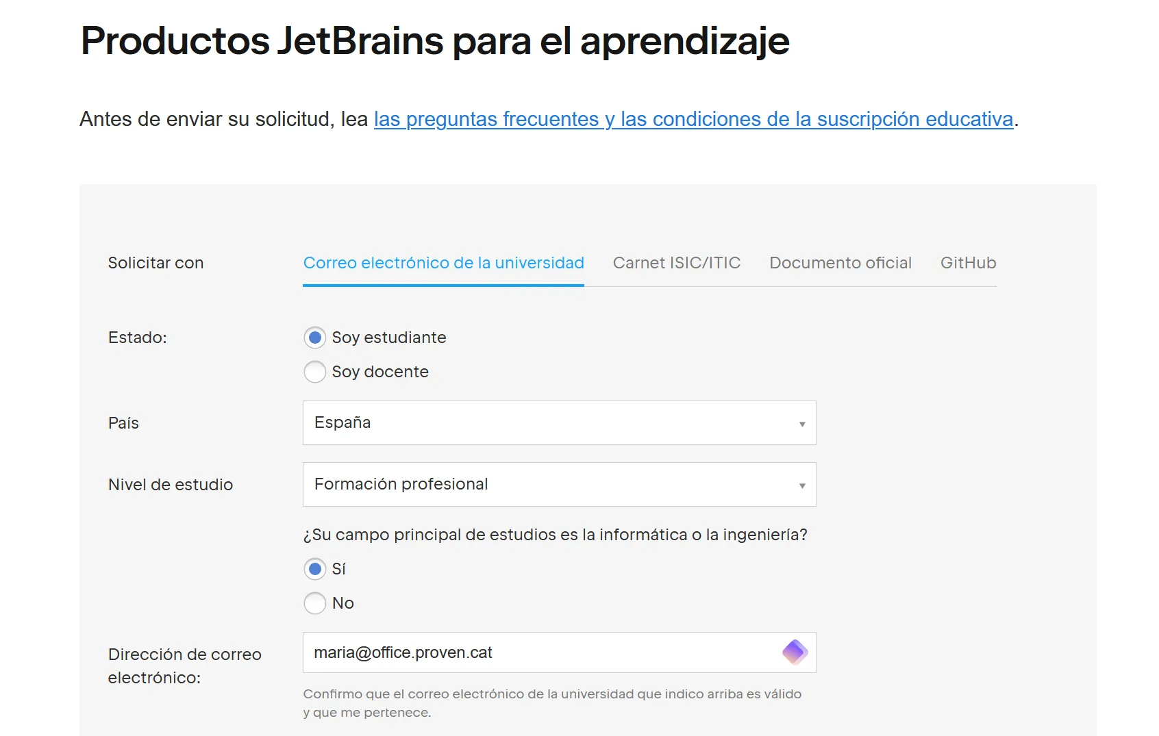 Section titled “Llicència educativa gratuïta”Com a estudiant o professor, pots utilitzar totes les IDEs de JetBrains per ús personal tant a l’escola com a casa, tal com s’explica a Free Educational Licenses