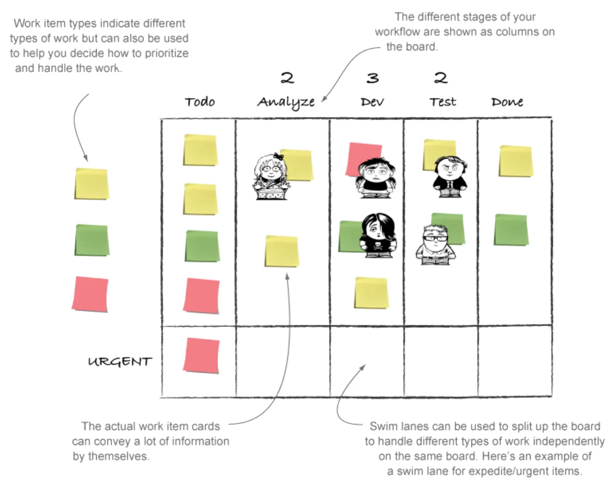 El tablero tradicional es una pizarra o algún espacio vacío de la pared donde se colocan pegatinas o fichas para visualizar el flujo de trabajo del grupo y cómo avanza el trabajo. El tablero se actualiza con frecuencia para que todo el mundo pueda ver la información más actual y actuar en función de ella.