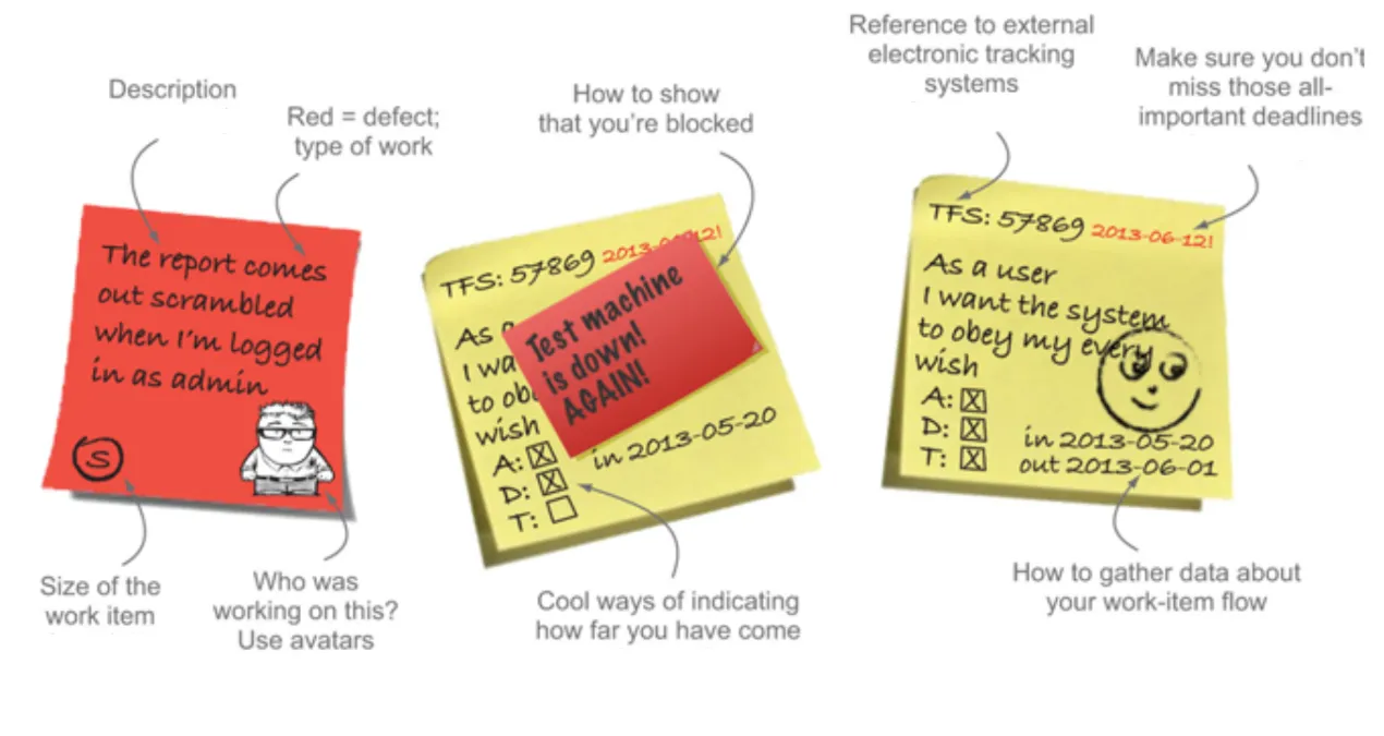 Cada nota adhesiva es una tarea que lleva anotada a realizar, quien la está haciendo, etc.