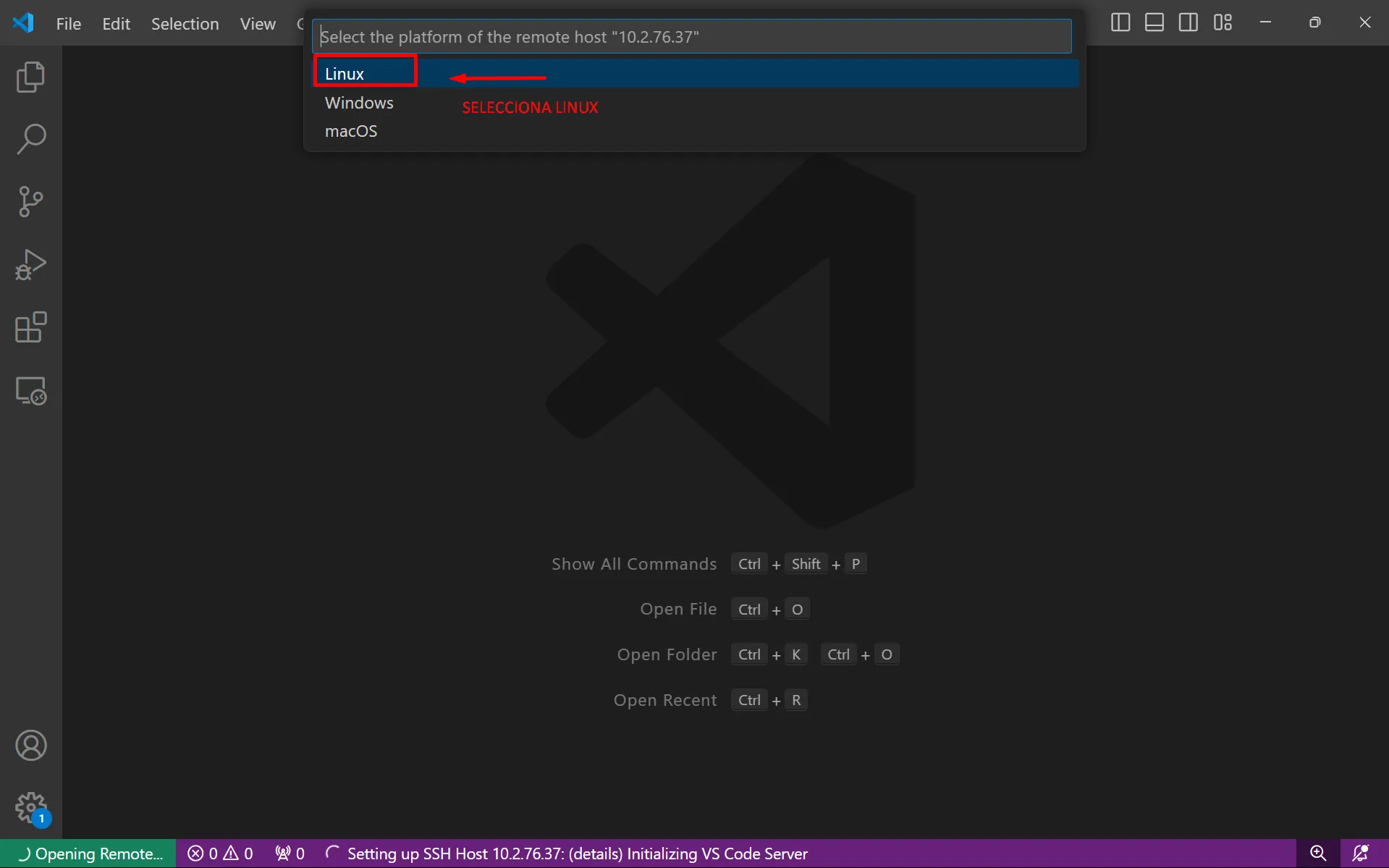 S’obrirà una nova finestra que et demana que seleccionis la plataforma del host remot.