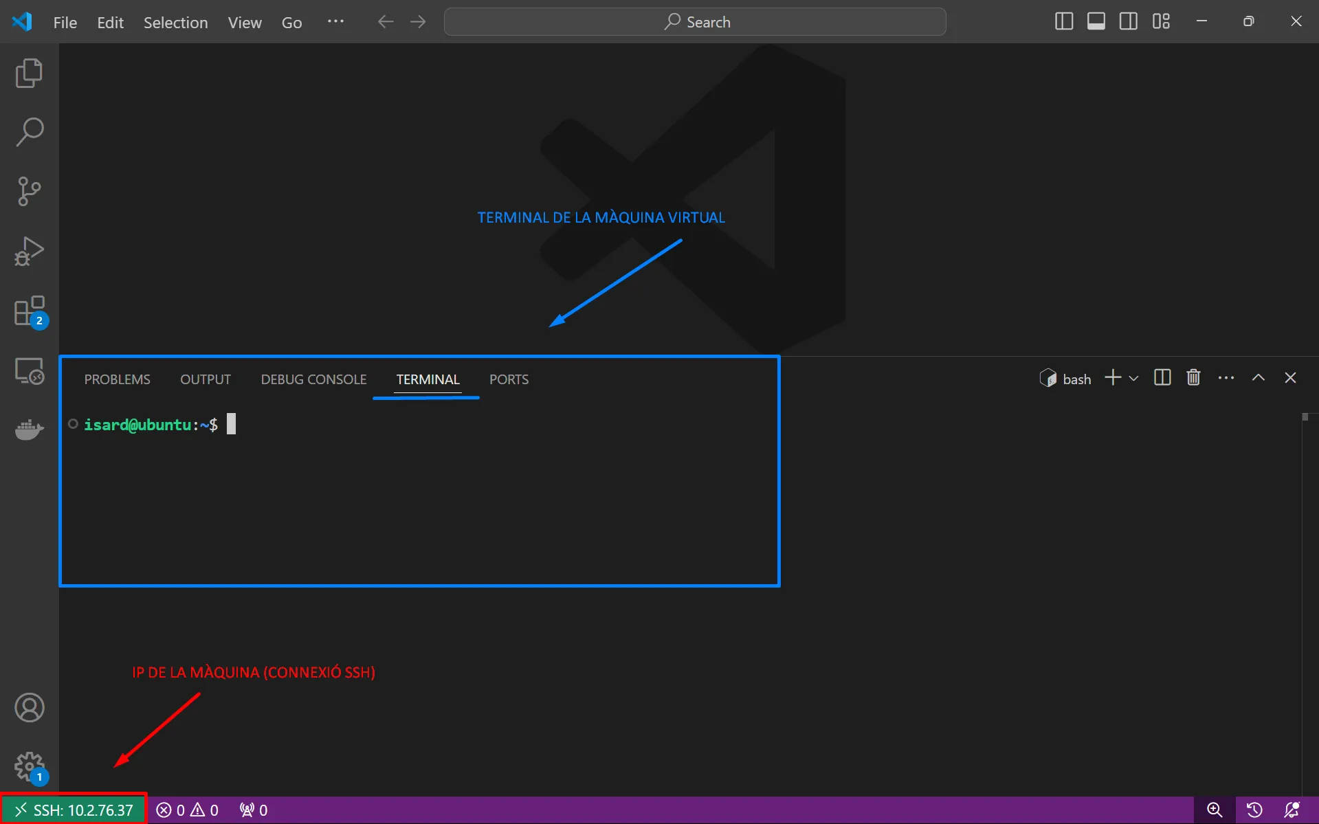 Section titled “Remote”VSCode et permet treballar amb màquines remotes des del Windows de la mateixa manera que si ho fessis en la màquina local.