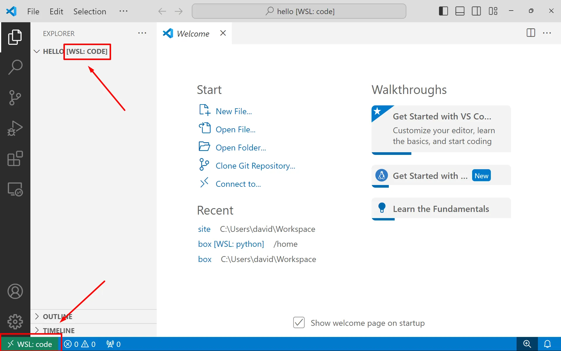 $ mkdir hello$ code helloInstalling VS Code Server for Linux x64 (eaa41d57266683296de7d118f574d0c2652e1fc4)Downloading: 100%...Compatibility check successful (0)code instal.larà una extensió que permet al VSCode que s’executà al Windows comunicar-se amb la màquina virtual Linux.