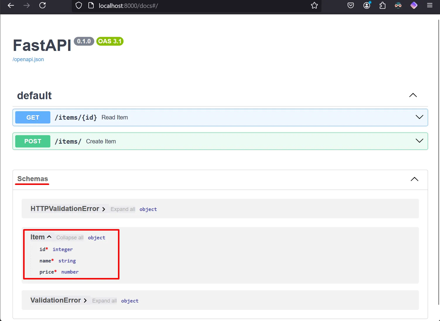 $ http -b localhost:8000/items/3{ "id": 3, "name": "Pixel 0", "price": 899.0}També pots veure que ara la teva API inclou un {% link “p:/ts/json-schema/” %} per Item: