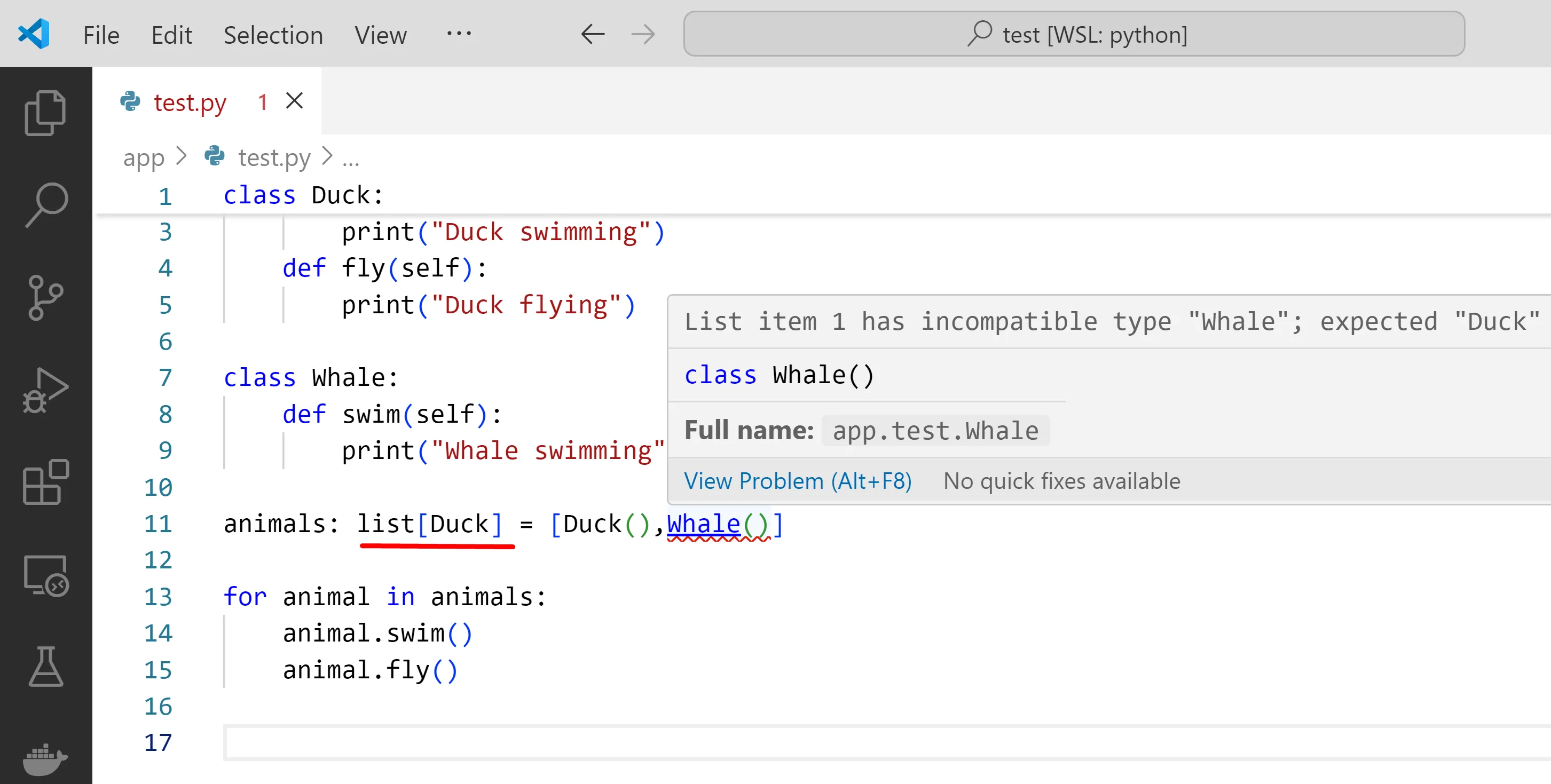 Si anotes la llista amb tipus list[Duck], mypy et dirà que l’error és afegir una ballena a una llista en que només haurien d’haver ànecs: