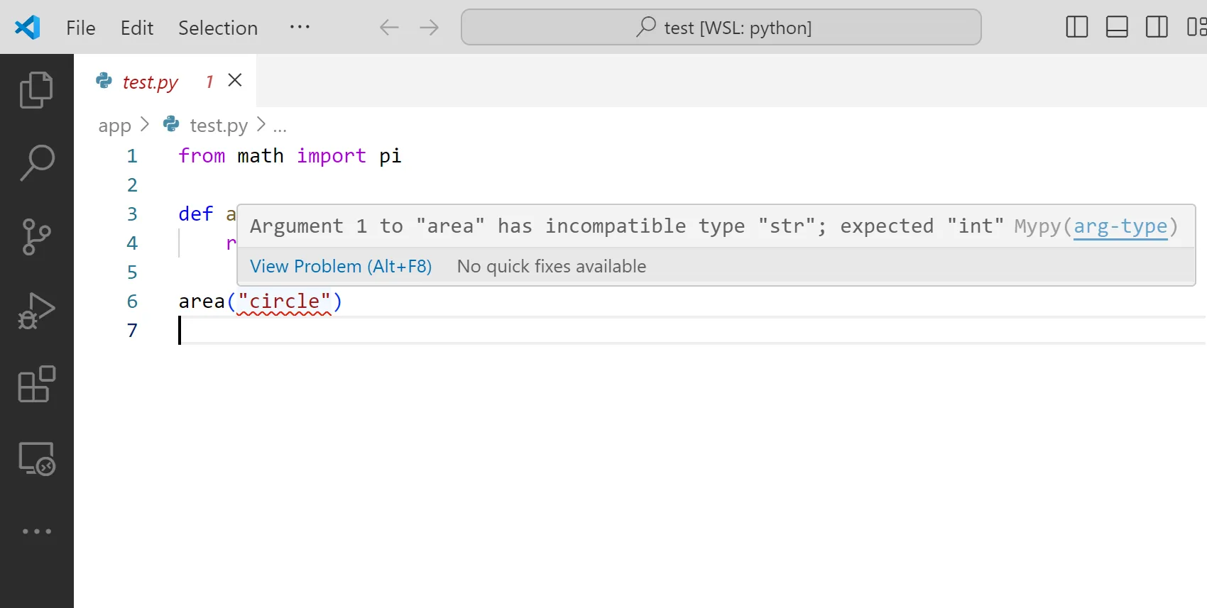 area("3")Com que el paràmter radius està anotat amb el “tipus” int, l’editor t’avisa de que no pots cridar la funció area amb un str: