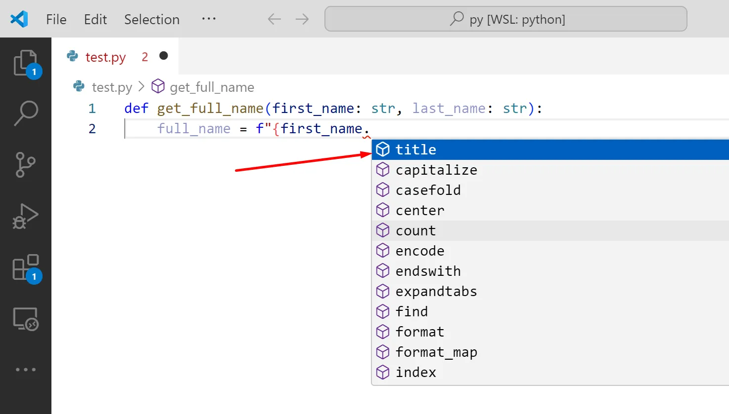 def get_full_name(first_name: str, last_name: str): full_name = f"{first_name.La IDE mira quins són els mètodes de la classe str i te’ls mostra: