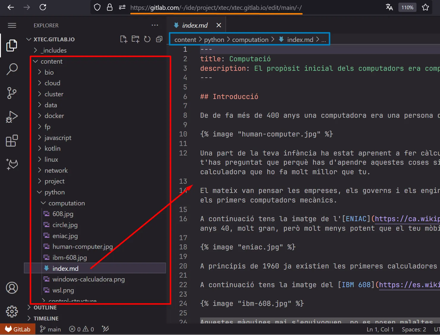 Una altra opció és editar els documents directament a l’Editor Web de Gitlab: Edit - xtec.dev