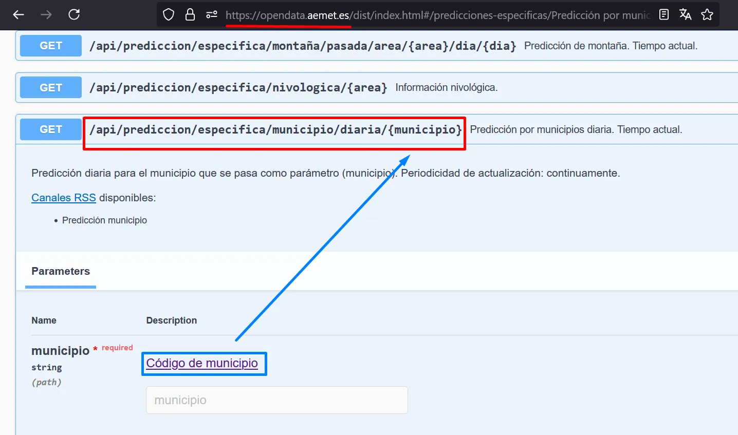 Si miras la documentació puedes ver que hay un endpoint que te permite consultar la predicción específica diaria de un municipio: /api/prediccion/especifica/municipio/diaria/{municipio}.