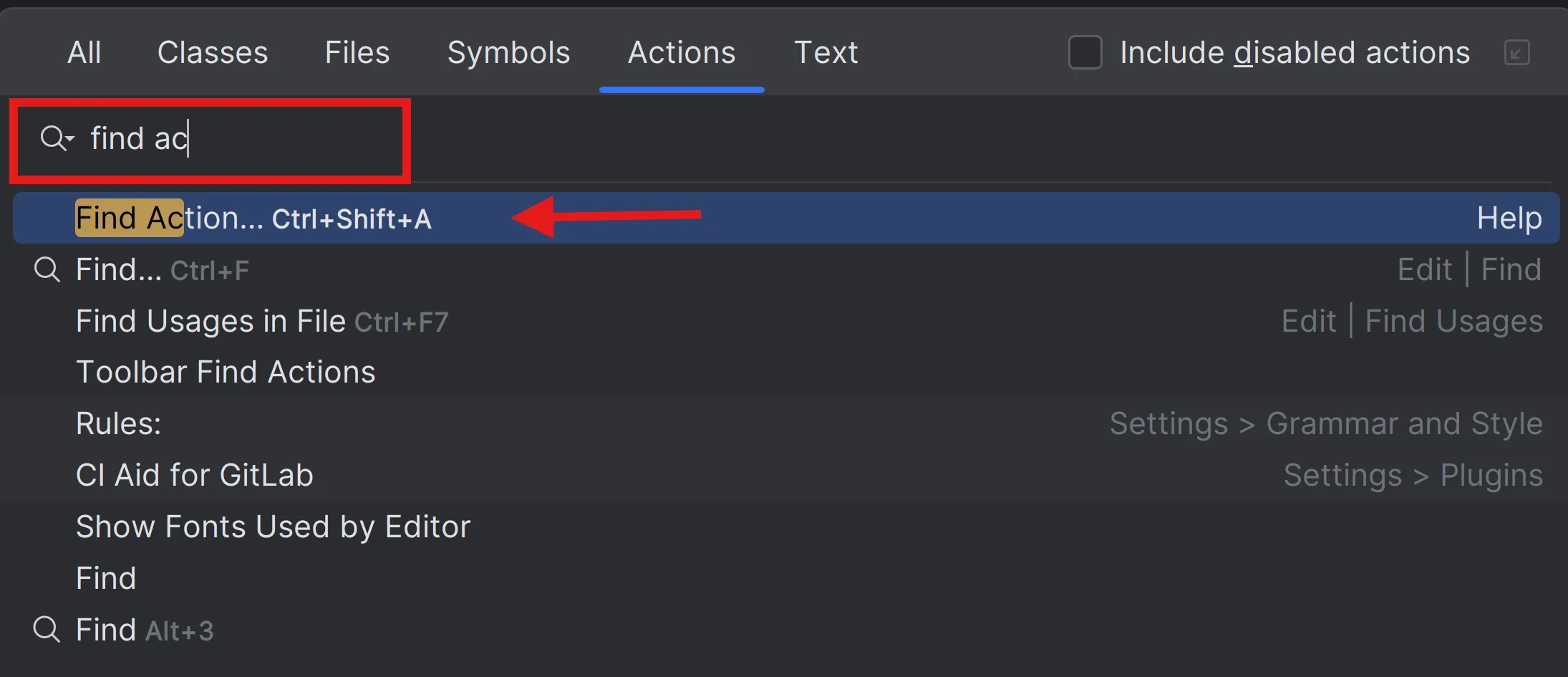Prem Ctrl Shift A i comença a escriure per obtenir una llista d’accions suggerides. Després selecciona l’acció necessària i prem Enter per executar-la.