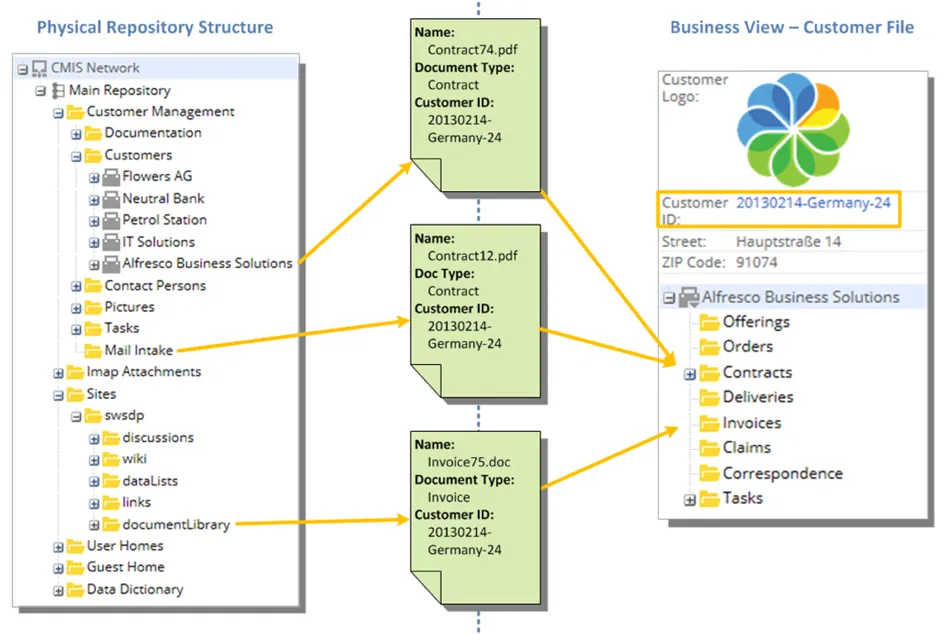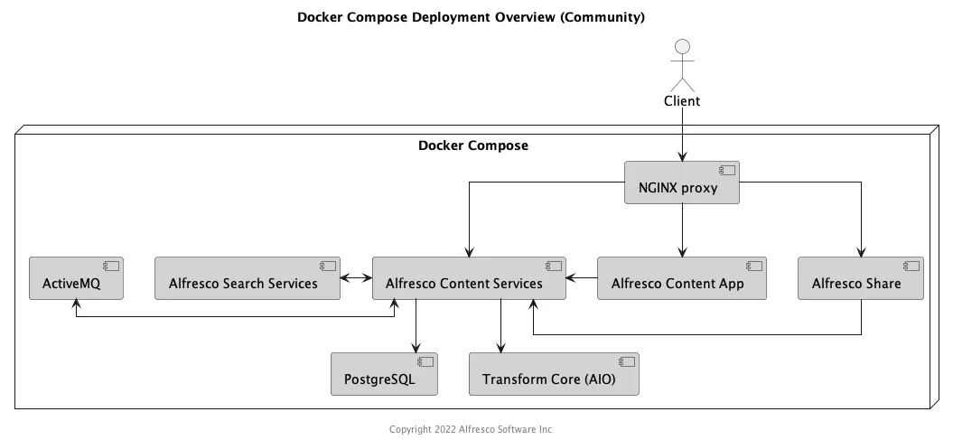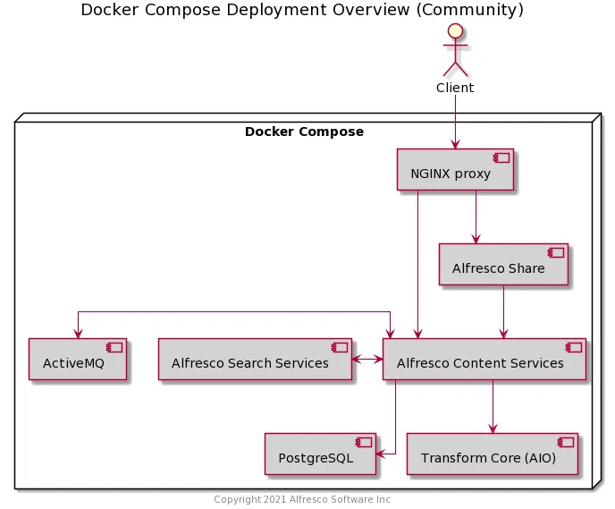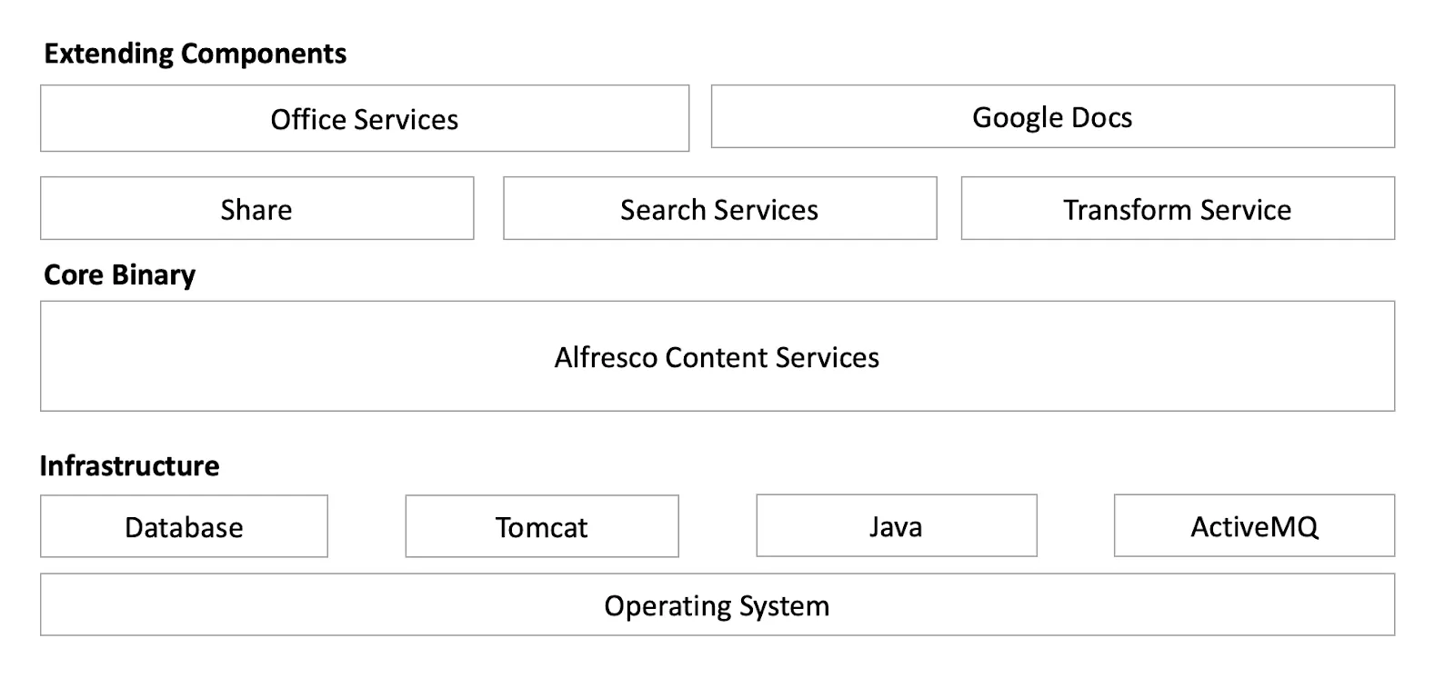 Alfresco consisteix en una sèrie de mòduls que cal desplegar i configurar conjuntament per formar la plataforma de serveis completa. Això ofereix als clients la flexibilitat per configurar la seva arquitectura de desplegament d’una manera coherent amb la seva estratègia de TI.