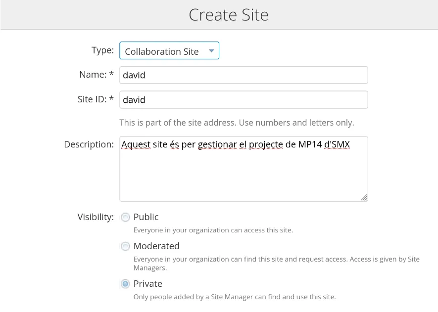 1.- Crea un site private amb el nom alumne i que tingui una descripció coherent.