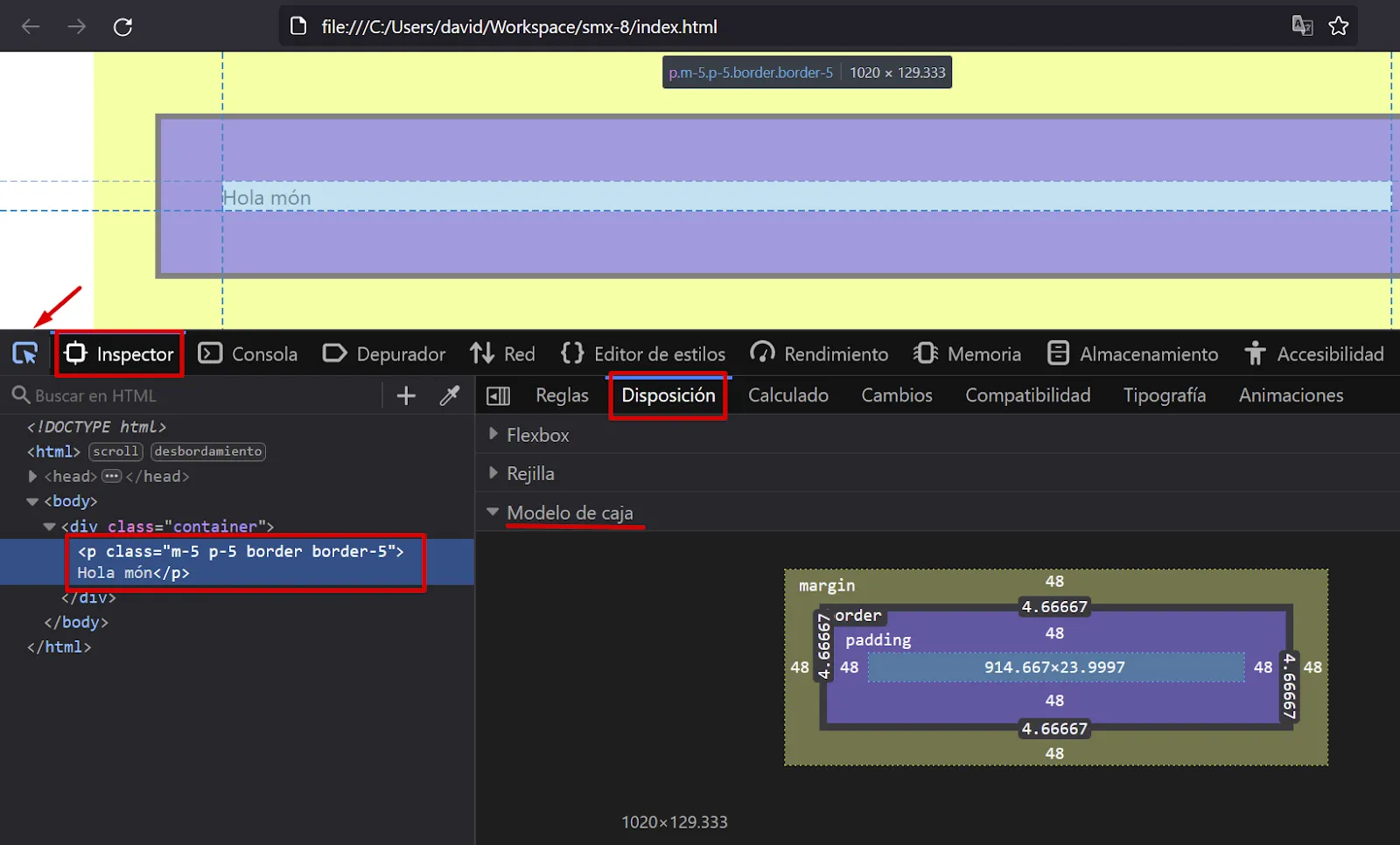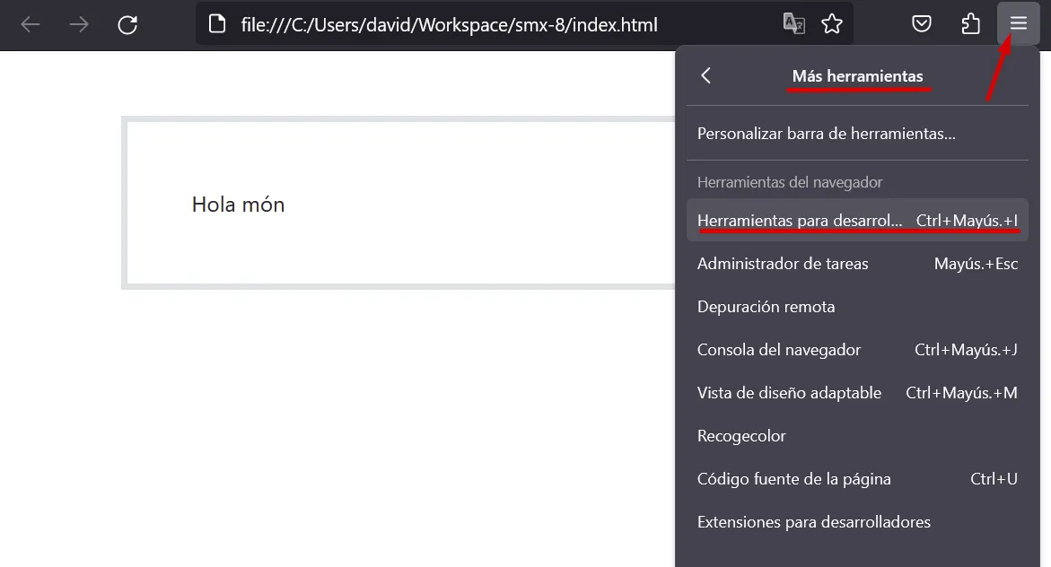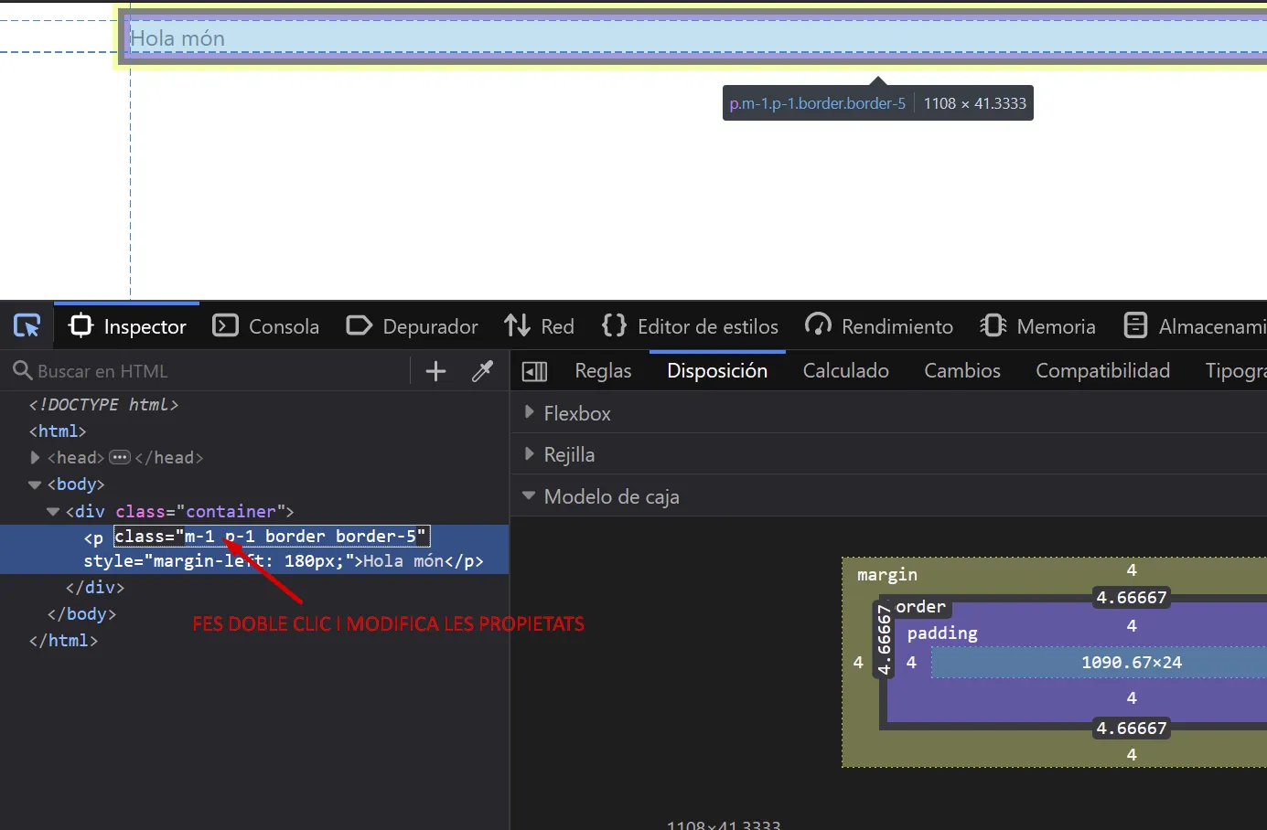 <!doctype html><html><head> <title>Firefox</title> <meta charset="utf-8"> <meta name="viewport" content="width=device-width, initial-scale=1"> <link rel="stylesheet" href=" https://cdn.jsdelivr.net/npm/bootstrap@5.3.1/dist/css/bootstrap.min.css"></head><body> <div class="container"> <p class="m-5 p-5 border border-5">Hola món</p> </div> </div></body></html>Obre’l amb el navegador web Firefox, i obre el menú “Herramientas para desarrolladores” ( o fes servir la combinació de tecles Ctrl + Mayús + I):