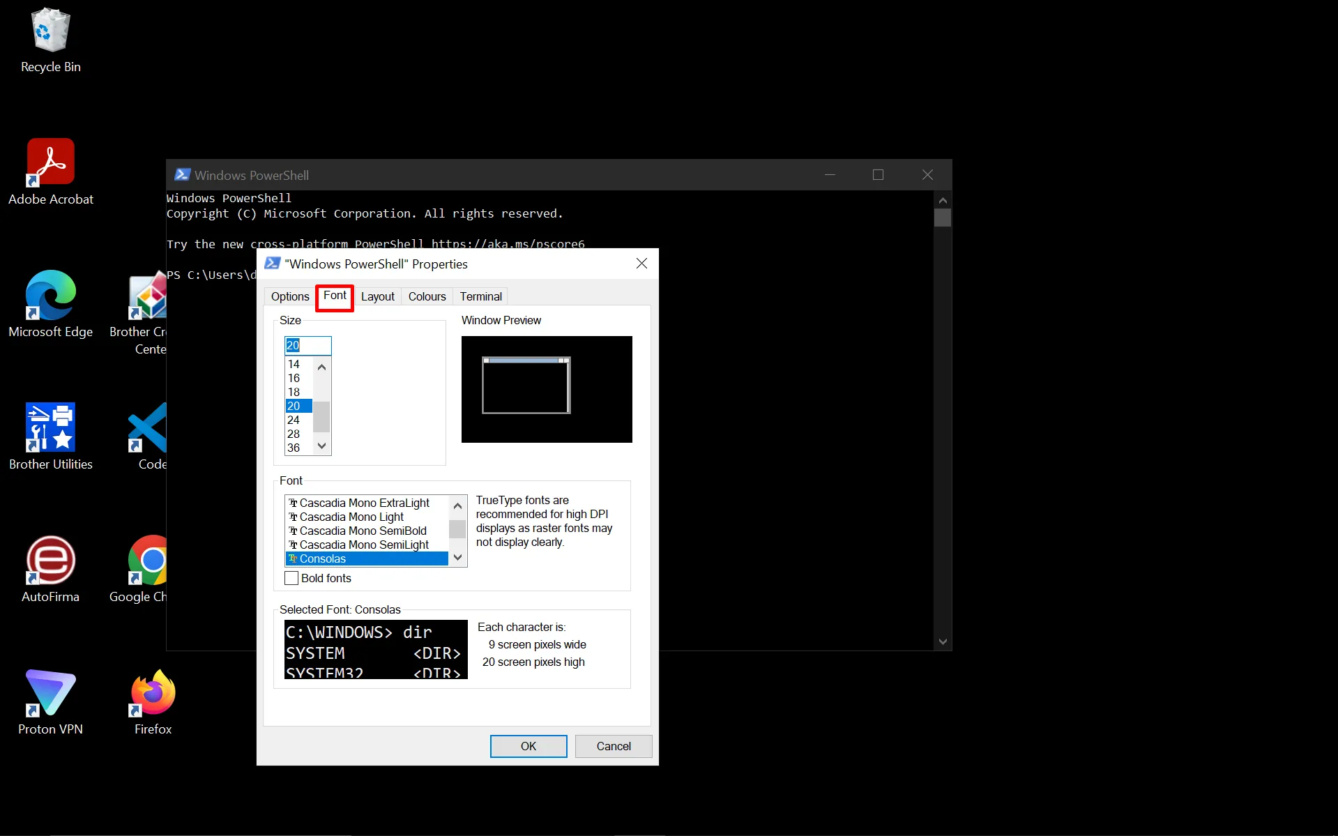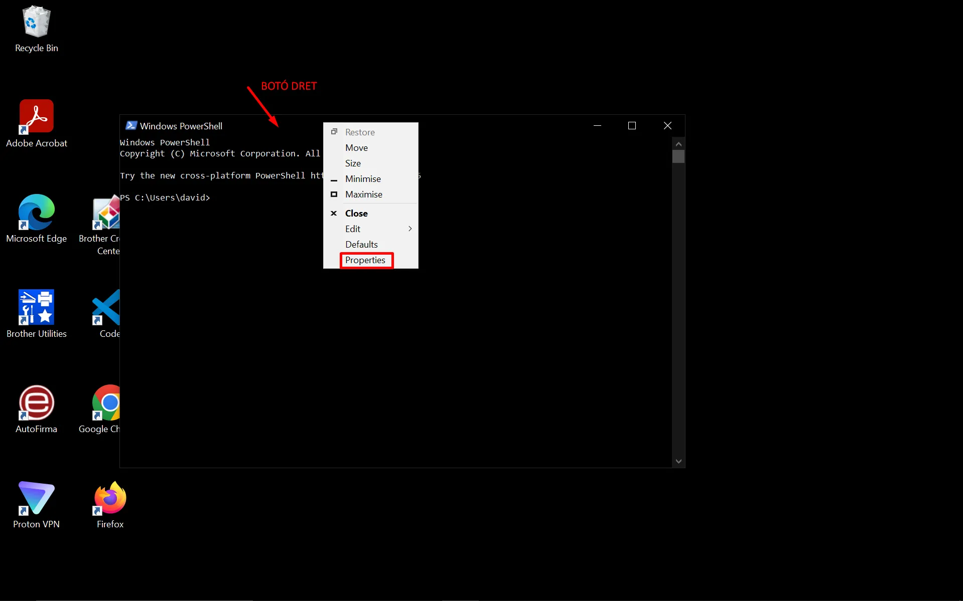 Has de fer clic amb el botó dret del ratolí a la barra de dalt de la finestra de la consola per obrir la finestra propietats: